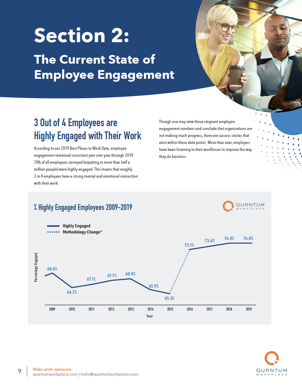 Quantum Workplace measures employee engagement using the e9 Model of Employee Engagement—a set of nine core engagement items that measure the relative strength of an employee’s emotional and mental connection with their work, team, and organization. "The e9" has been found to be a reliable measure of employee engagement and has been validated against a variety of indicators.