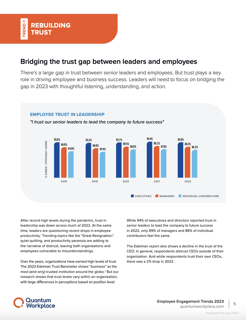 The research from this report was derived from the Best Places to Work contest—powered by Quantum Workplace. This nationwide contest measures the employee experience of over 1 million voices across thousands of the most successful organizations in the United States. From this respondent pool, we conduct an opt-in, independent research panel with over 32,000 individuals who share their workplace experiences. This unique vantage point gives us the ability to understand workplace trends to supply insights that help other organizations succeed.