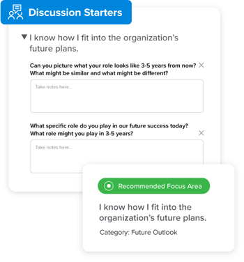 Conducting 1-on-1 meetings allows managers to discuss important, engagement-centric topics with employees. In fact, our research shows that employees with more frequent 1-on-1s are 2.4X more engaged. Look for engagement software that streamlines this process with simple, best-practice templates to easily start and track ongoing, meaningful conversations.